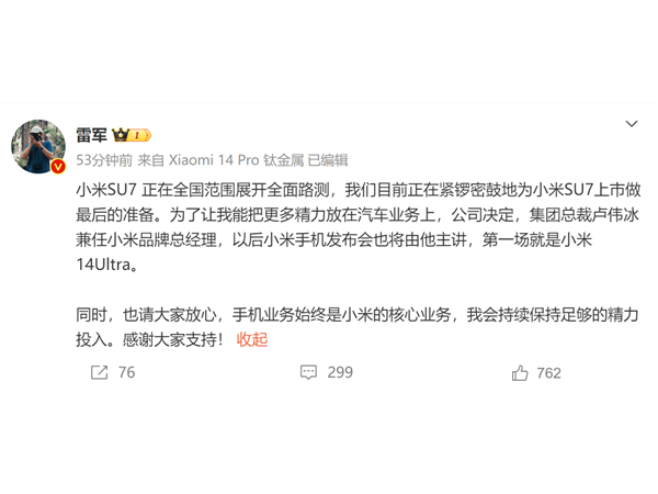 突然!雷军暂别小米手机 聚焦汽车业务:卢伟冰兼任 首讲小米14 Ultra