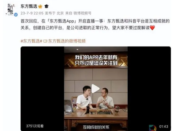 俞敏洪首次回应东方甄选启动自有App直播:公司正常行为 不影响与抖音合作