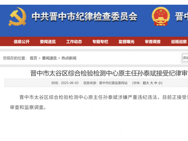 晋中市太谷区综合检验检测中心原主任孙泰斌接受纪律审查和监察调查