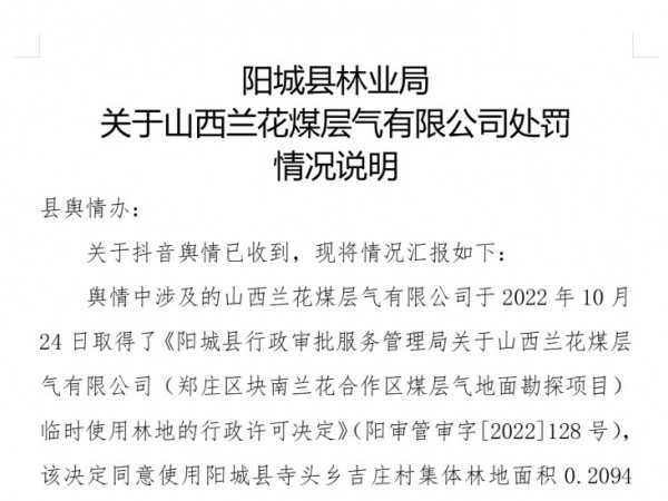 阳城县林业局关于山西兰花煤层气有限公司处罚情况说明