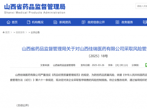 山西省药品监督管理局关于对山西佳瑞医药有限公司采取风险管控措施的通告