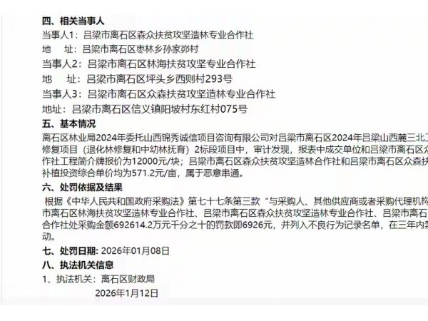 【吕梁离石区三合作社被处罚并限制政府采购】