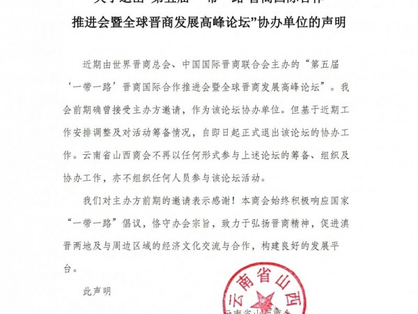 云南省山西商会关于退出“第五届'一带一路’晋商国际合作推进会暨全球晋商发展高峰论坛”协办单位的声明