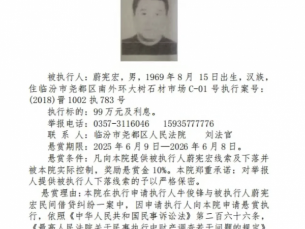 临汾蔚宪宏被尧都区法院悬赏