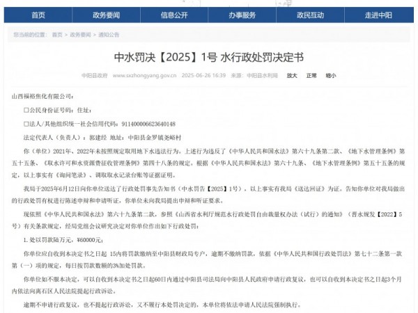 山西福裕焦化有限公司未按照规定取用地下水违法行为被罚款60000元
