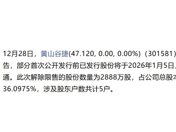 黄山谷捷2888万股限售股份解禁 2026年1月5日上市流通