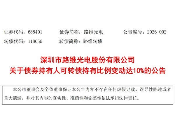 路维光电关于债券持有人可转债持有比例变动达10%的公告