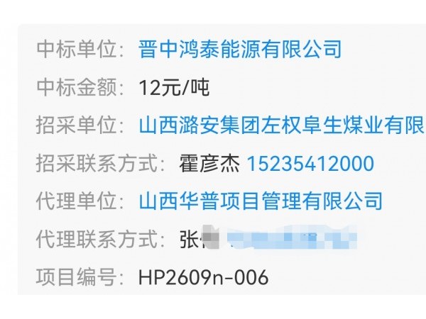 12元/吨 晋中鸿泰能源中标 左权阜生煤业铁路煤炭代装