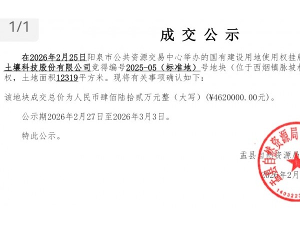山西东大土壤462万中标盂县1.23万平方米地块