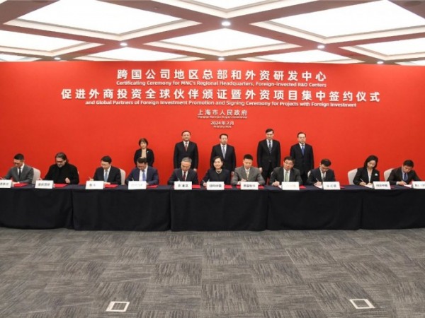 上海市长为跨国公司总部和研发中心、促进外商投资全球伙伴颁证,见证项目签约
