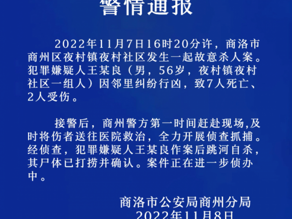 陕西发生故意杀人案致7死2伤,嫌犯作案后跳河自杀