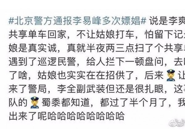 共享单车惹的祸:演员李易峰嫖妓被抓全过程被曝光,事情起因惊呆众网友