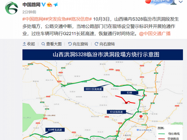 山西境内S328临汾市洪洞段发生多处塌方,公路交通中断