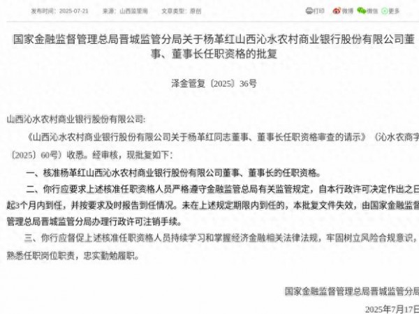 监管批复!杨革红就任山西沁水农商行董事、董事长