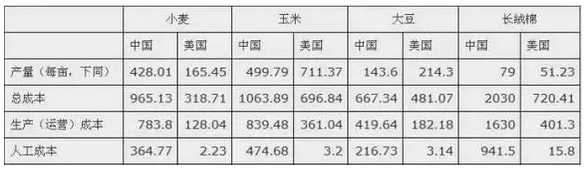 中美主要粮食生产成本对比