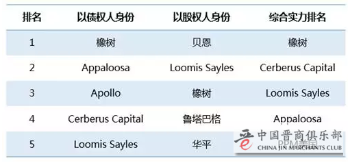 橡树资本在困境投资机构中综合实力排名第一,他们的策略是:复苏期小心的买,危机期以对折甚至更低的价格买入债券;如果企业起死回生,债券价格回升,橡树则轻松抛掉,安全的稳稳获利;如果该企业进入破产重组阶段,他们以最大的债权人回购各类债务,引导重组,最后成为重组后新的股东和债权人。