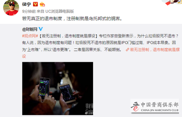 中国晋商俱乐部在微博上注意到中国晋商俱乐部顾问、知名财经评论家、天使投资人侯宁老师点评了一篇财新网的文章“若无注册制,退市制度就是摆设”,侯宁认为“若无真正的退市制度,注册制就是乌托邦式的祸害。”。