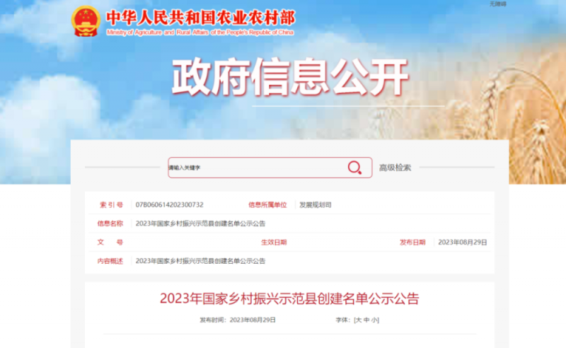 山西日报新媒体报道 8月29日,从农业农村部官网获悉,为贯彻落实《中共中央、国务院关于做好2023年全面推进乡村振兴重点工作的意见》部署,农业农村部开展第二批国家乡村振兴示范县创建评审,经地方推荐、专家评审,拟将北京市平谷区等100个申报单位纳入2023年国家乡村振兴示范县创建名单,公示期为8月29日至31日。其中,山西3地上榜,分别是:山西省泽州县、山西省襄垣县、山西省大同市云州区。