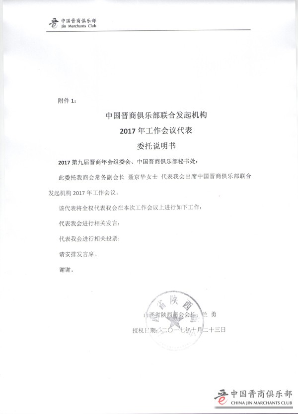 山西省陕西商会常务副会长、山西宸华医康科贸有限公司总经理聂京华女士将代表山西省陕西商会参加中国晋商俱乐部联合发起机构2017年工作会议。