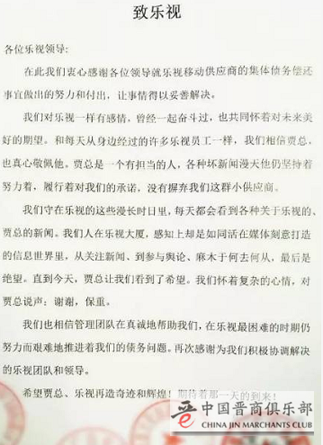 @晓聪 :老板加油!作为乐视影业五年多的老员工,虽然刚刚离开了,但是衷心希望乐视一切安好!我们都是有过梦想并且没有放弃的乐视人!愿老东家安好!愿老贾安好!乐视加油!老贾加油!也期待他日再重逢!