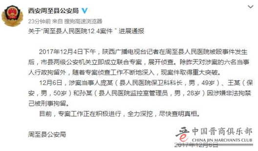打人事件发生后,周至县委县政府介入调查,于12月5日公布了事件处理进展: 周至县公安局依法行政拘留涉事6人;周至县人民医院涉事院长停职接受调查;对涉事的周至县人民医院相关副院长、保卫科科长予以撤职。