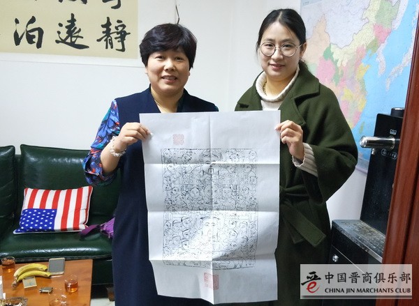 马文青代表中国晋商俱乐部秘书处向吕江爱会长赠送了平阳木版年画“财”(陶唐会馆董事长赵军友情提供)。