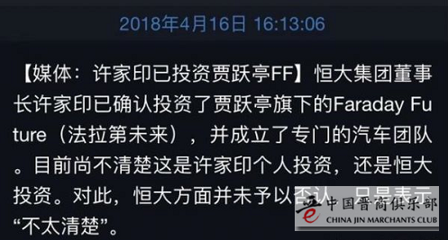 FF内部人士也表示,“目前FF内部人员有听说许家印入股,贾跃亭对内说,投资人要求FF不能公布他的身份,投资方会择机公布。”
