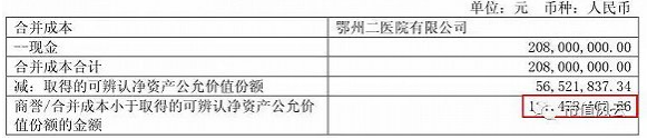 济民制药2017年1月起将鄂州二医院有限公司纳入合并财务报表范围,投资成本2.08亿元大于该股权对应的可辨认净资产公允价值的部分0.57亿元的差额,确认商誉为1.51亿元。