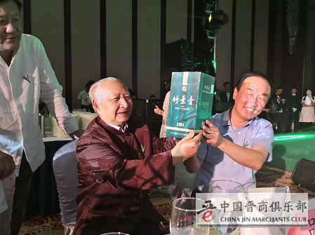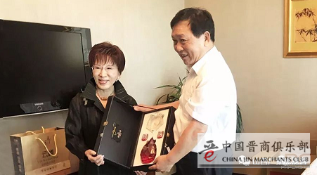 ▲汾酒集团党委书记、董事长李秋喜赠送玫瑰汾酒给原中国国民党主席洪秀柱