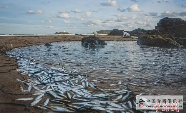 英国康沃尔郡,鱼群搁浅在Gwithian海滩上,场面令人震撼。这是不到三周内康沃尔郡海滩上发生的第三起鱼群搁浅事件。
