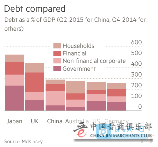 经济模式转变的根本性指标,应该是储蓄与投资的下滑以及消费的增长。这种转型之所以必要,不仅仅是因为许多投资是浪费,还因为投资和债务的爆发式增长有关。如今,中国投资占国内生产总值(GDP)的比重远高于东亚其他高增长经济体的历史最高水平。此外,根据麦肯锡全球研究所(McKinsey Global Institute)的数据,中国的整体负债率极高,而且集中于非金融类公司。中国的整体负债率超过了多个发达国家,比如美国。(参见图表)