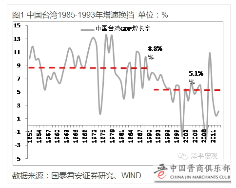 台湾的增速换挡发生在1985-1993年间。台湾1951-1989年的39年间属于高速增长追赶阶段,年均增速8.8%,1989年人均GDP达到9538国际元,相当于美国的41.4%,到达增速换挡的阀值时点。1990-2010年年均增长5.1%,进入中速增长阶段。台湾的增速换挡比较成功,平滑过渡,没有出现危机倒逼。