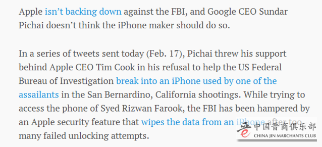 但FBI局长James Comey上周抱怨称,FBI无法访问枪手的手机内容,因为苹果有自己的加密技术,FBI毫无办法。所以向法院申请取强制措施让苹果为FBI开后门。