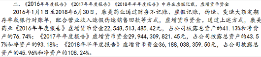 在2016年、2017年年报和2018年半年报中,康美药业还通过财务不记账、虚假记账,伪造、变造大额定期存单或银行对账单,配合营收造假伪造销售回款等方式虚增货币资金,分别高达225.49亿元、299.44亿元、361.88亿元。