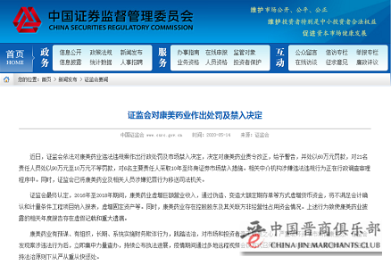 证监会曾依法对康美药业违法违规案作出行政处罚及市场禁入决定,决定对康美药业责令改正,给予警告,并处以60万元罚款,对马兴田、许冬瑾等21名责任人员处以90万元至10万元不等罚款,对6名主要责任人采取10年至终身证券市场禁入措施。