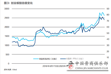 张夏认为,今年创业板表现突出,一定程度上是受政策改革预期的提振,但更主要源于市场的结构性行情。首先,自2019年以来,新一轮科技上行周期开启,TMT板块表现突出,创业板集中了大量的科技股;其次,医药板块受益于疫情大幅上涨,新能源汽车上涨,再加上各类投资者拥抱确定性,抱团“科技+医药+消费”,这些行业龙头在创业板占据很高比重,如宁德时代、迈瑞医疗等,龙头上涨带动了创业板的上行。