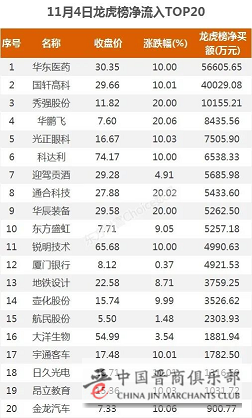 11月4日,上榜龙虎榜个股中,资金净流入最多的是华东医药,为5.66亿元。数据显示,该股日内涨停收盘,全天换手率5.28%。具体看,深股通净买入3.13亿元。