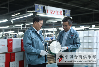 冠华不锈钢创始人黄勇(左)与车间主任讨论喜时的拼多多定制款煎锅的细节。该产品与欧洲顶级厨具品牌WMF在同一条生产线上制造。摄影:大尾