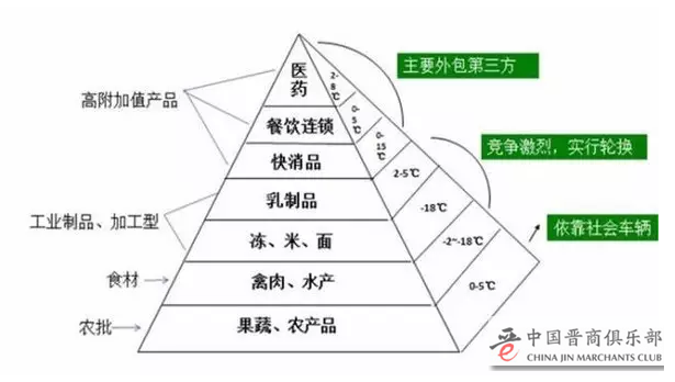 冷链物流“金字塔型客户”分为七层,塔顶客户为高附加值的医药、餐饮连锁、快消品类,冷链物流多数采取外包形式;向下为工业制品和加工型乳制品、速冻米面食品类,也是冷链物流竞争最佳激烈的市场;然后是食材型禽肉和水产类,塔底型客户为果蔬、农产品类。