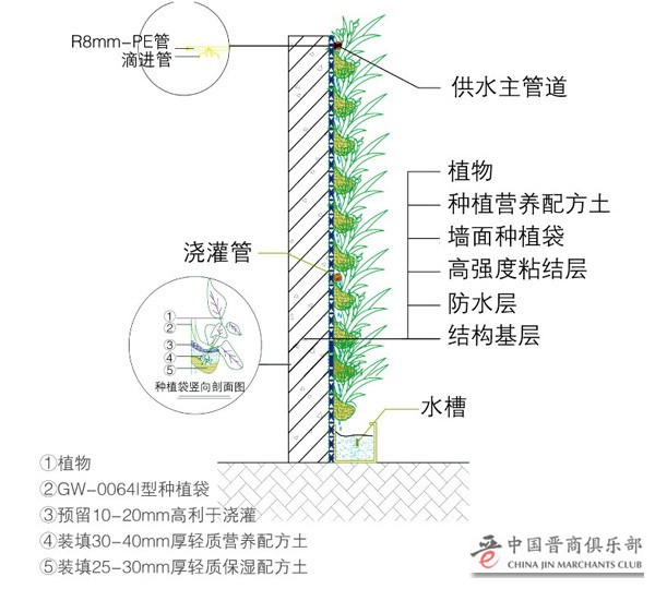 垂直绿化,又称植物墙,植物袋垂直终止技术核心组建为垂直种植袋,使用防水粘合一体涂料将种植袋粘结于建筑载体上,然后将植物种植于植物袋,通过储水箱接连在顶排培土袋口加装滴管即可完成滴管系统,由植物袋材质特性通过重力牵引水流浇灌至每一个培土袋口,是植物获得水份而繁茂省长。植物袋种植技术成本低、施工周期短、立体效果明显、维护容易,适合大中小型墙面、高架桥、隔音板、隧道、街道护栏等场所。
