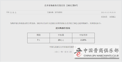央行于13日早间披露,当日以利率招标方式开展了20亿元逆回购操作。