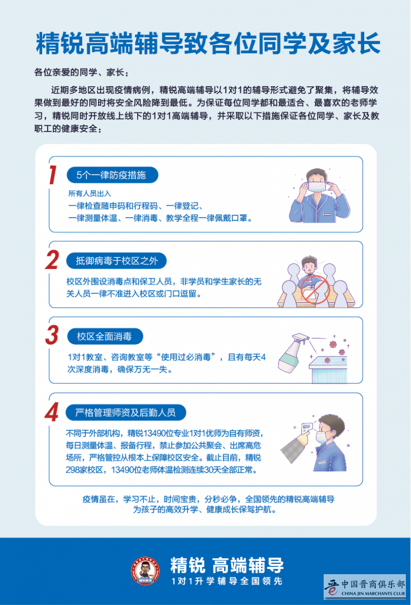 为了保护每一位学生、家长以及老师的安全,精锐也制定了一系列严格的校区防疫措施。这里有一封信,请您查收,我们将按照信中的承诺严格执行。