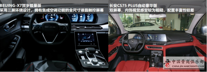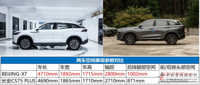 对比两款车型,从表格中可以直观的看出来,BEIJING-X7贺岁限量版无论是从车身尺寸、轴距还是后排腿部空间、头部空间上都有绝对的优势。BEIJING-X7贺岁限量版拥有4710mm*1892mm*1715mm的三维尺寸和2800mm的轴距,相比之下,要比长安CS75 PLUS自动豪华版长宽高、轴距分别高40mm、27mm、15mm、90mm,为整车的空间利用率合理设计提供了基础。