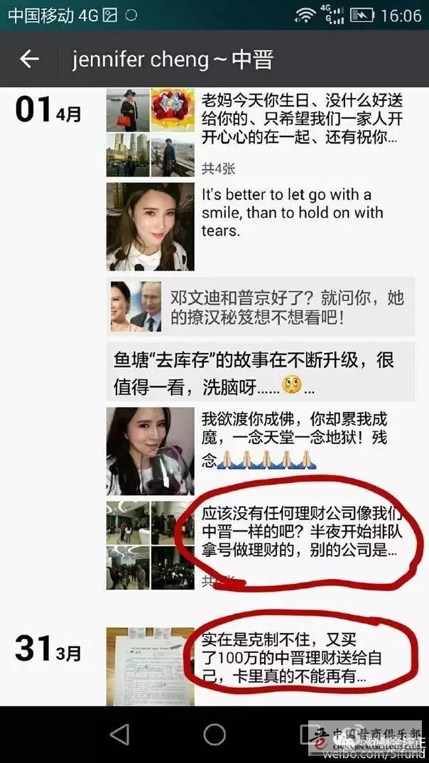 比如,公司的美女投资顾问程明在朋友圈炫富无底线: