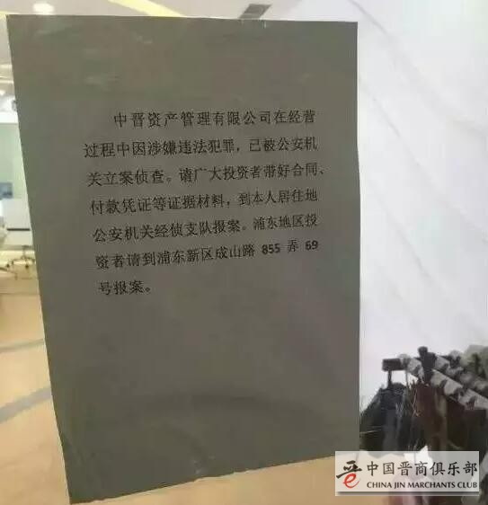 4月6日下午15时左右,上海市公安局官方微博“警民直通车-上海”发布名为《上海公安查处涉嫌非法吸收公众存款和非法集资诈骗犯罪的“中晋系”相关联公司》的公告。