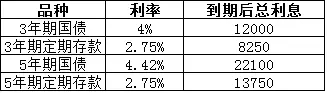 那么,以同样本金10万元购买国债和银行存款获得的利息差别: