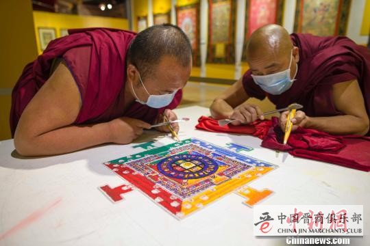 4月21日,“藏传之光”西藏宗教艺术品展正在山西太原展出。其中,藏传佛教中神秘的艺术“坛城沙画”也在此亮相,两名来自青海省的师父将花费五天时间在现场作画,为民众完整呈现出了藏传佛教中这一独特、精致的宗教艺术。