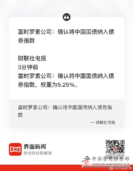 富时罗素公司:确认将中国国债纳入债券指数,权重为5.25%。