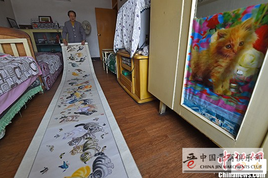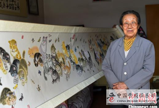 4月28日,山西太原桃园路一社区,87岁老人安文锁展示自己创作的国画作品《耄耋图》。这幅长12米的画卷中,画有100只形态各异的猫以及100只翩翩起舞的蝴蝶,猫蝶相戏,便有了“耄耋”的寓意