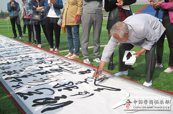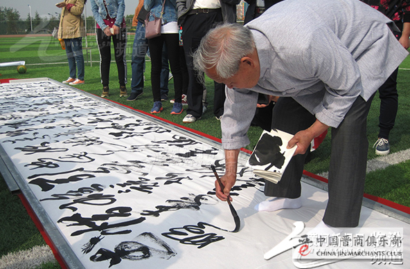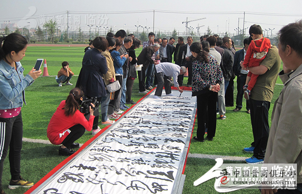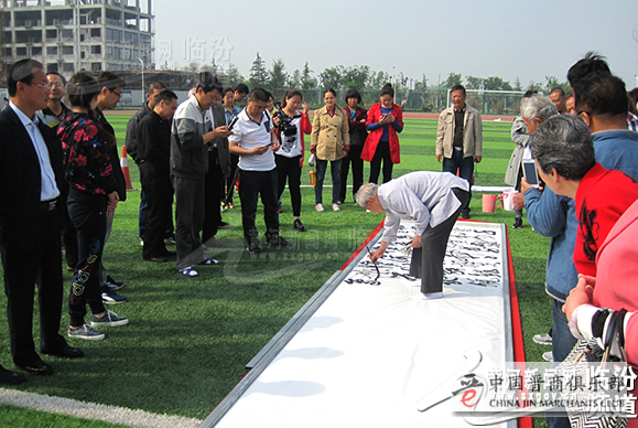 5月9日上午,公园绿茵茵的草坪上,铺着16张用宣纸连接起来长达10米、宽4尺的巨幅长卷,闻喜县民间书法家、中国黄河草书研究院副院长——年已八旬的潘笃学先生,精神矍铄,聚精会神,挥毫泼墨,凭借记忆,一字不差,一气呵成,将一首脍炙人口的毛泽东主席《沁园春. 雪》诗词跃然纸上。潘老先生遒劲有力的榜书和龙飞凤舞的狂草,气势奔放,神韵兼备,尽显大家风度,令在场人员大饱眼福和赞叹不已,并吸引众多游人争相观赏和拍照……